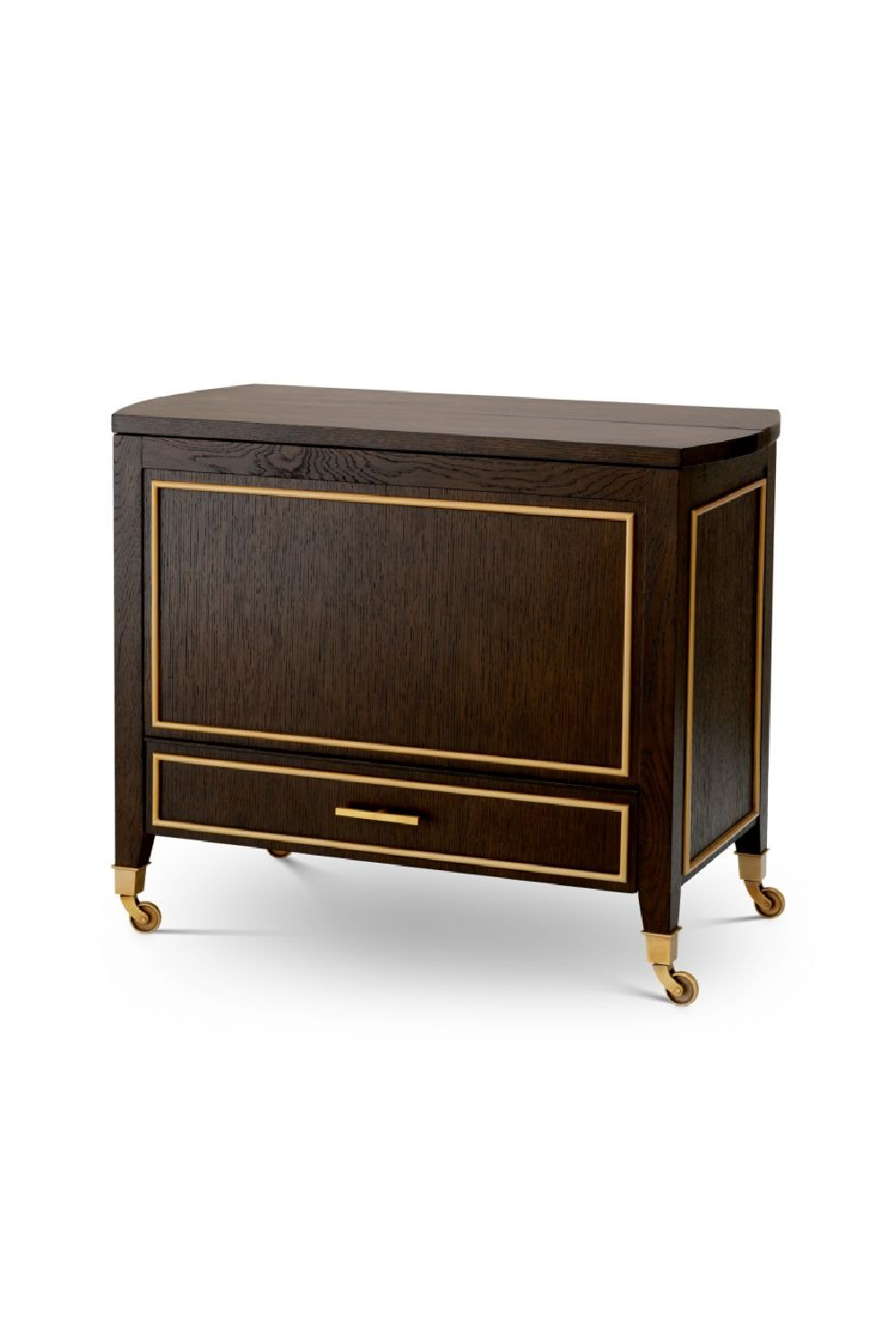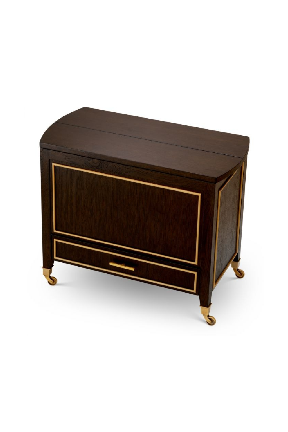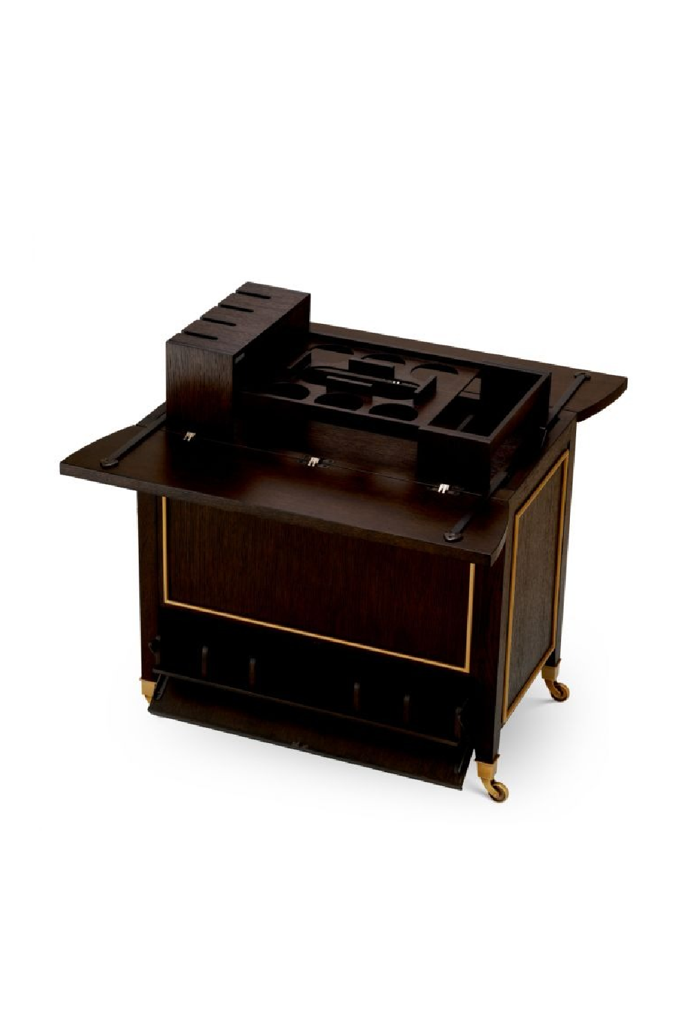 Le chariot Galliano presente un style art deco en placage de chene brun riche associe a une finition en laiton brosse.