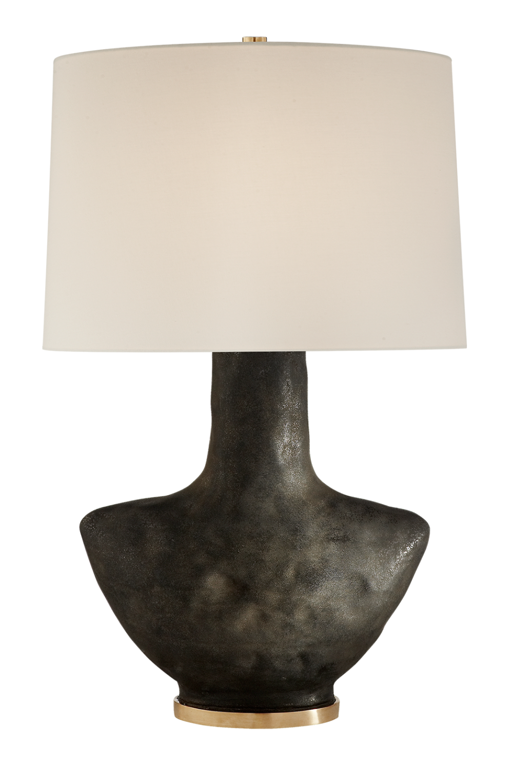 Une lampe de table en ceramique blanche merveilleusement tactile avec un abat-jour en laiton bruni antique, concue par Kelly Wearstler. La base a ete recouverte d'une glacure ceramique reactive qui, une fois cuite, donne au materiau un eclat nacre unique. Avec ses formes organiques et ses accents metalliques, cette lampe de table degage un air d'opulence.