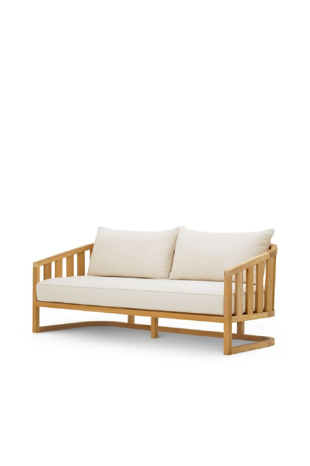 Découvrez le canapé d’extérieur Aruba, où le veinage chaleureux du teck naturel se marie harmonieusement avec des coussins moelleux en tissu Sunbrella aux tons neutres.