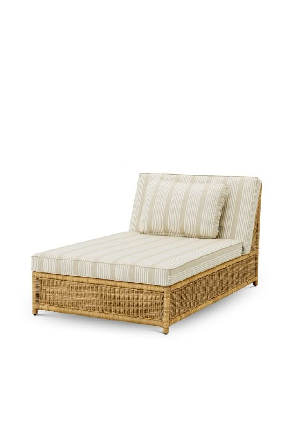 Revêtus d’un tissu rayé beige Saville, ses coussins invitent à une détente sans effort, tandis que sa structure en faux rotin durable associe sophistication et résistance. Son design modulable offre une élégance polyvalente, idéale pour les espaces de vie extérieurs en quête d’un charme raffiné et apaisant.