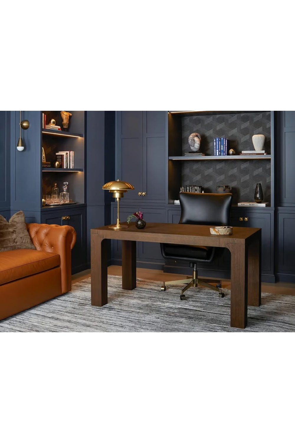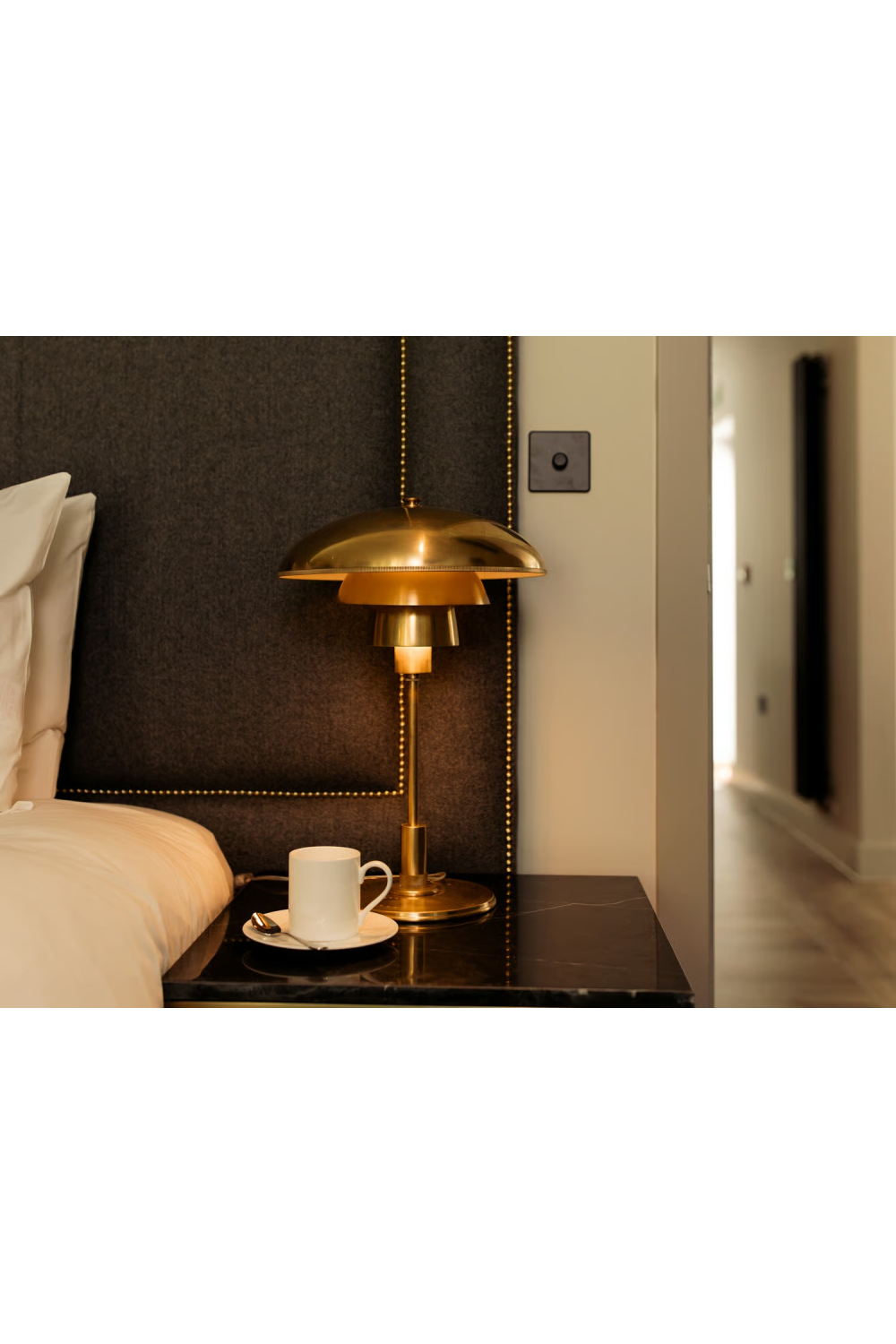 A stunningly unique hand finished antique brass desk lamp designed by designer Thomas O'Brien. The mushroom shade adds an interesting shape to a room, with a nod to Art Deco style and enough quirkiness for cool modern interiors.