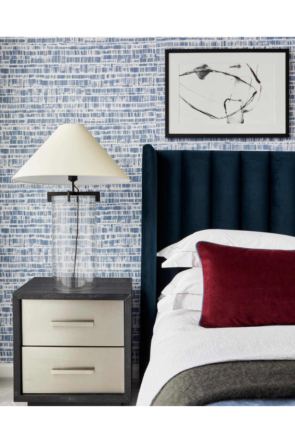 Brooks presente des lignes modernes et elegantes avec une base en cristal totalement transparente, un abat-jour en lin creme et des finitions en fer noir. Concue par J. Randall Powers, Brooks s'adapte parfaitement aux interieurs contemporains et sophistiques, ajoutant un interet sculptural et un jeu visuel subtil grace a sa base transparente.