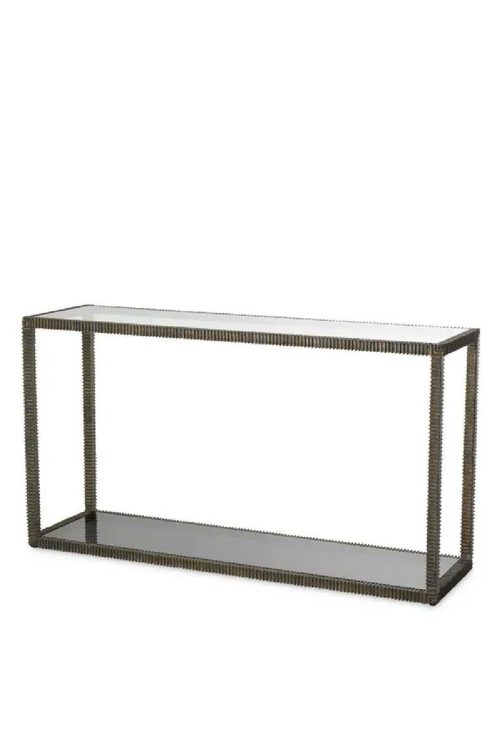 Encadrée d’une finition bronze patiné et surmontée d’un plateau en verre raffiné, cette console dégage une grandeur discrète. Son design architectural, à la fois audacieux et aérien, en fait un point focal idéal dans une entrée ou derrière un canapé. Conçue dans le cadre de la collection Bethesda, elle s’associe parfaitement avec l’armoire, la table basse et la table d’appoint assorties.