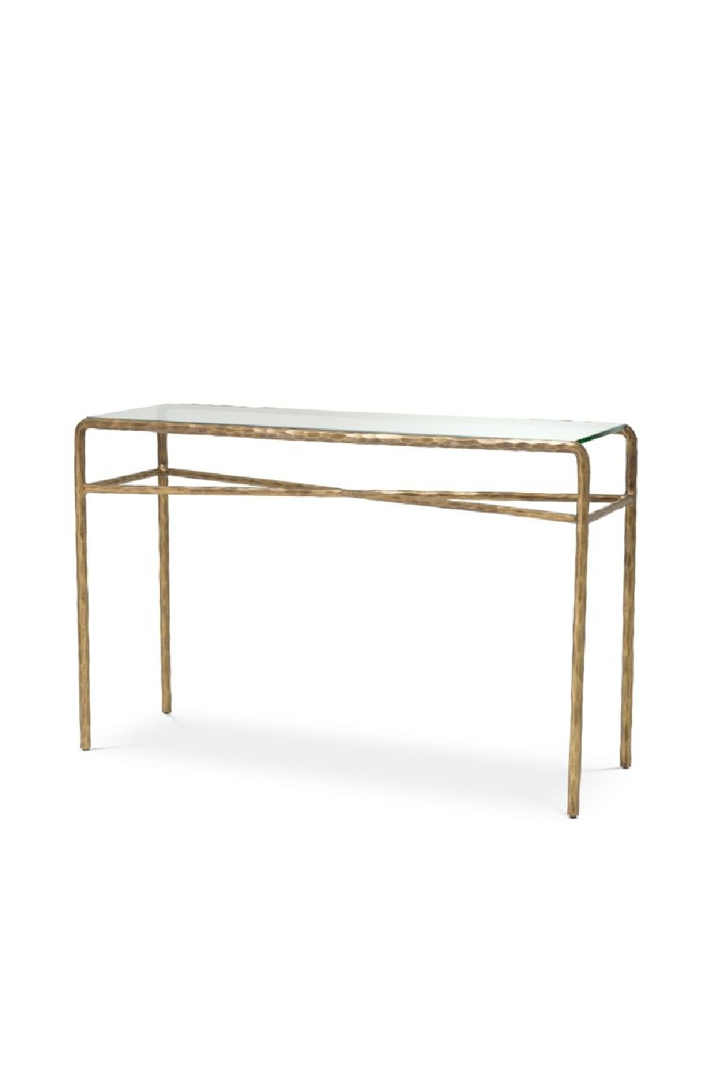 La console Xandria présente un plateau en verre transparent reposant sur une structure en laiton vintage martelé, offrant une pièce maîtresse à la fois légère et élégante.