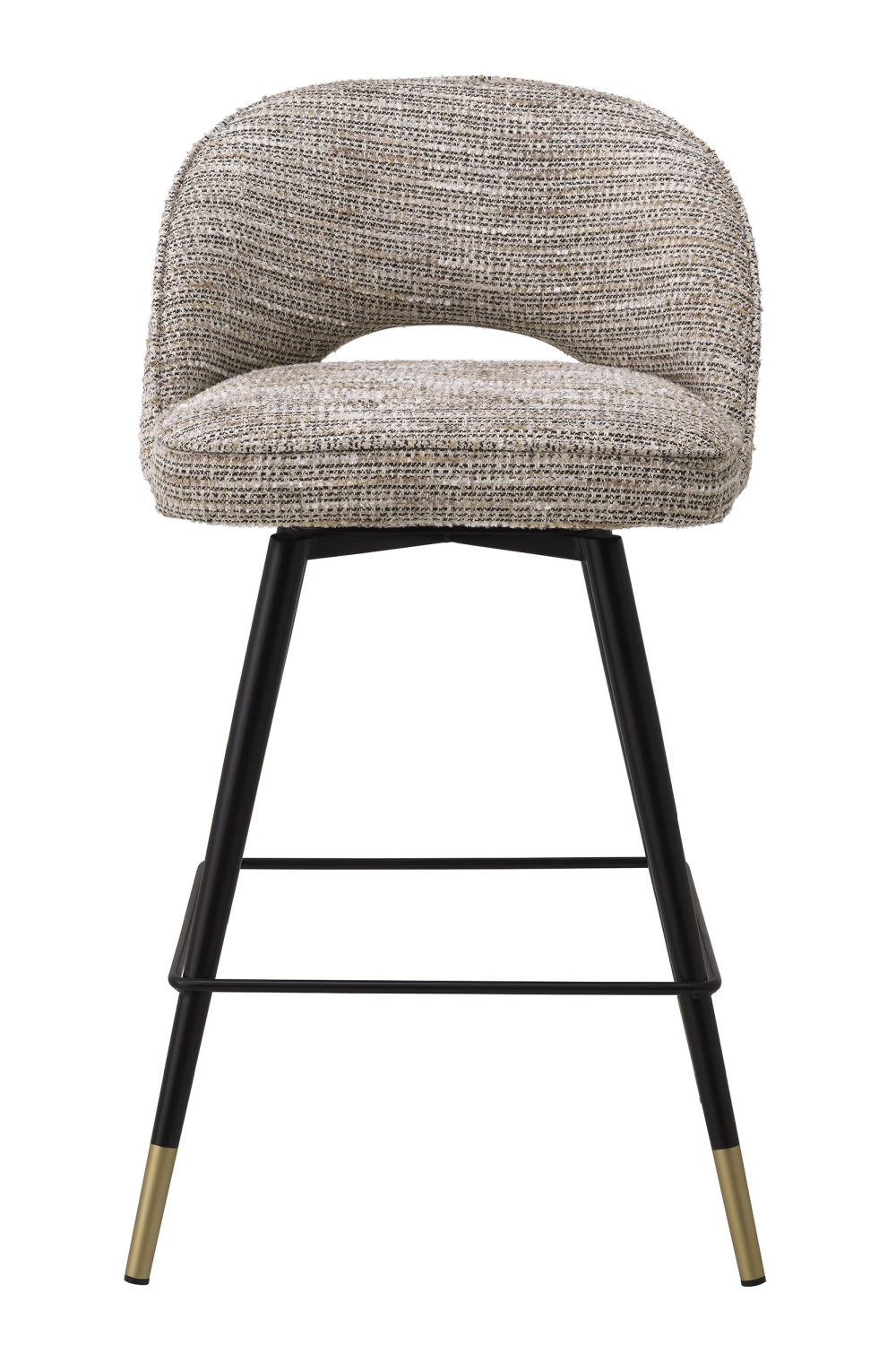 Dote de pieds effiles noirs avec des embouts dorés et d’un revetement Mademoiselle beige, chaque tabouret de comptoir presente un dossier sans accoudoirs, ouvert dans sa partie inferieure avant l’assise. A combiner avec les chaises de salle a manger et les tabourets de bar de la meme serie.
