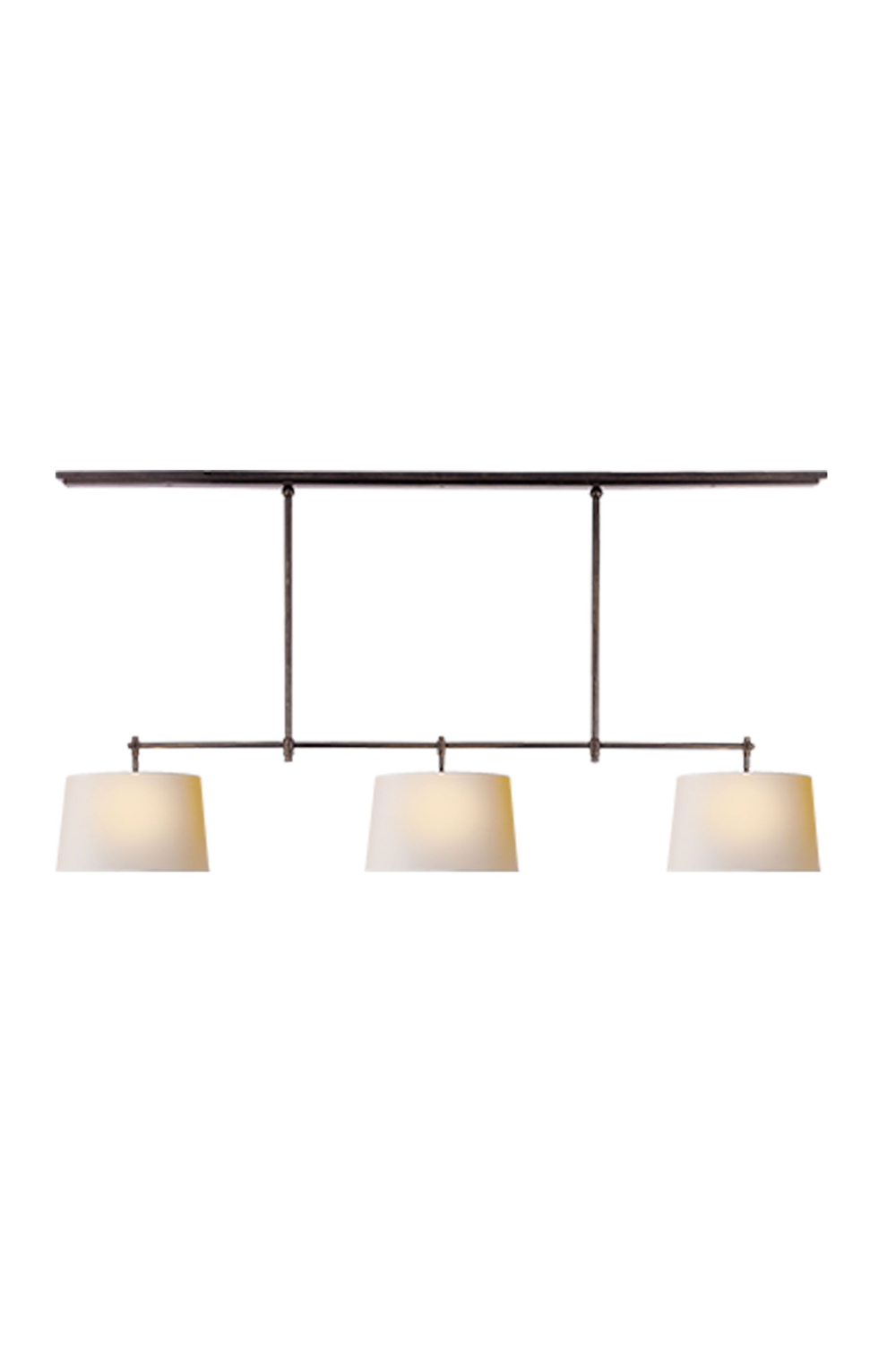 Une suspension de billard en laiton antique avec trois abat-jour en papier naturel et une silhouette lineaire interessante. Concue par le designer iconique Thomas O'Brien, placez Bryant au-dessus d'une table a manger pour ajouter une touche de chic industriel moderne a votre interieur. Disponible en deux tailles.