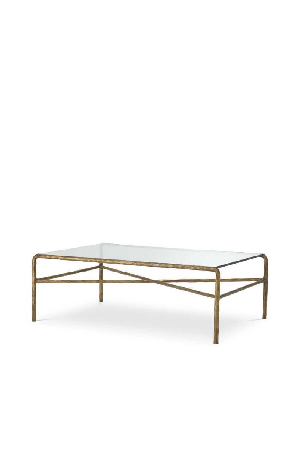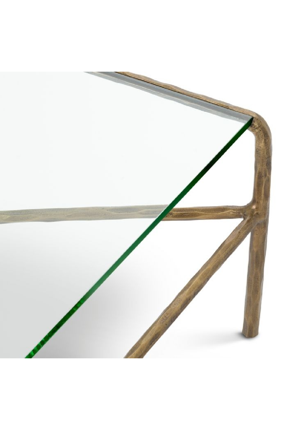 La table basse Xandria présente un plateau en verre transparent élégamment soutenu par une structure en laiton vintage, soigneusement travaillé avec une texture martelée qui dégage une sophistication raffinée.